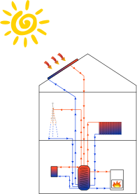 Abbiamo inserito un camino che riscalda 500 litri di acqua in un accumulatore con il quale si riscalda la casa e si produce acqua calda sanitaria in maniera efficiente. Il sistema è collegato anche alla caldaia a gas e predisposto per il collegamento con pannelli solari termici.
